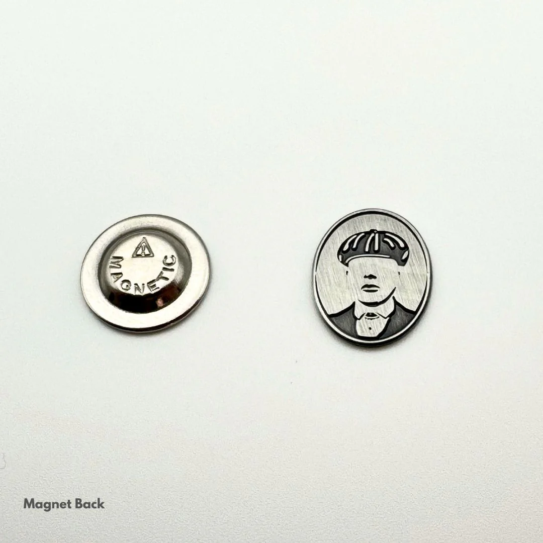 NOW WITH A MAGNETIC BACK! No more holes in the cap, no more poking your head with the bulky butterfly clasp. This strong magnet works through even the thickest of cap materials, including leather!