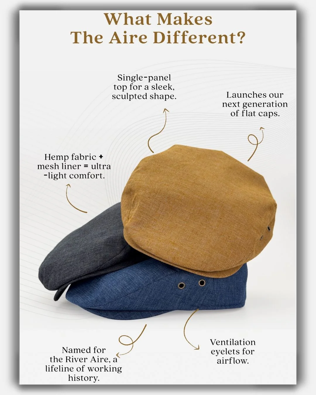 Crafted from breathable, lightweight hemp, The Aire takes its name from the River Aire—a lifeline of Yorkshire, England's coal country and a vital artery of an industrial rise. This cap pays tribute to that legacy with clean lines and natural materials, balancing working-class heritage with today’s daily wear and style.